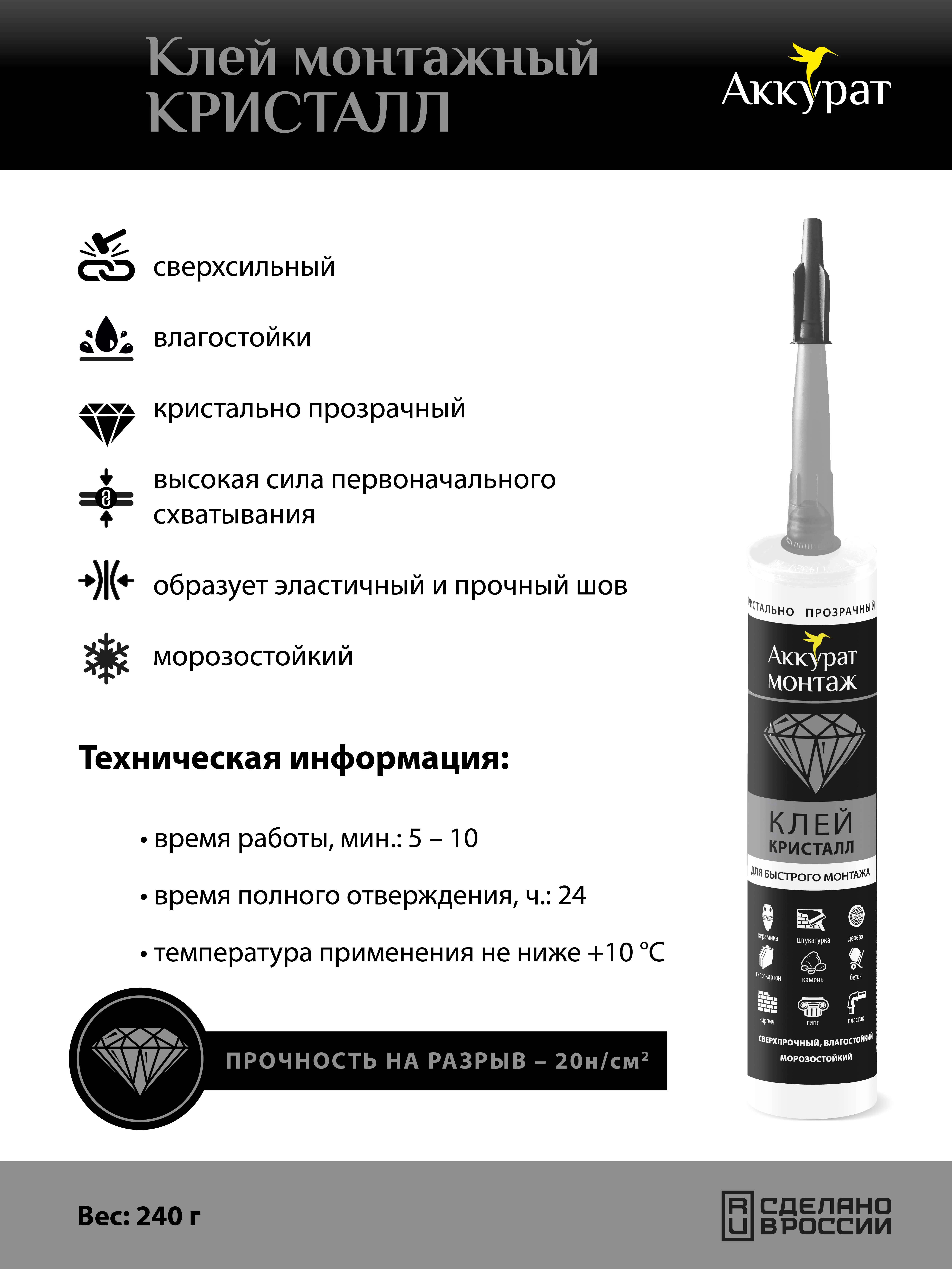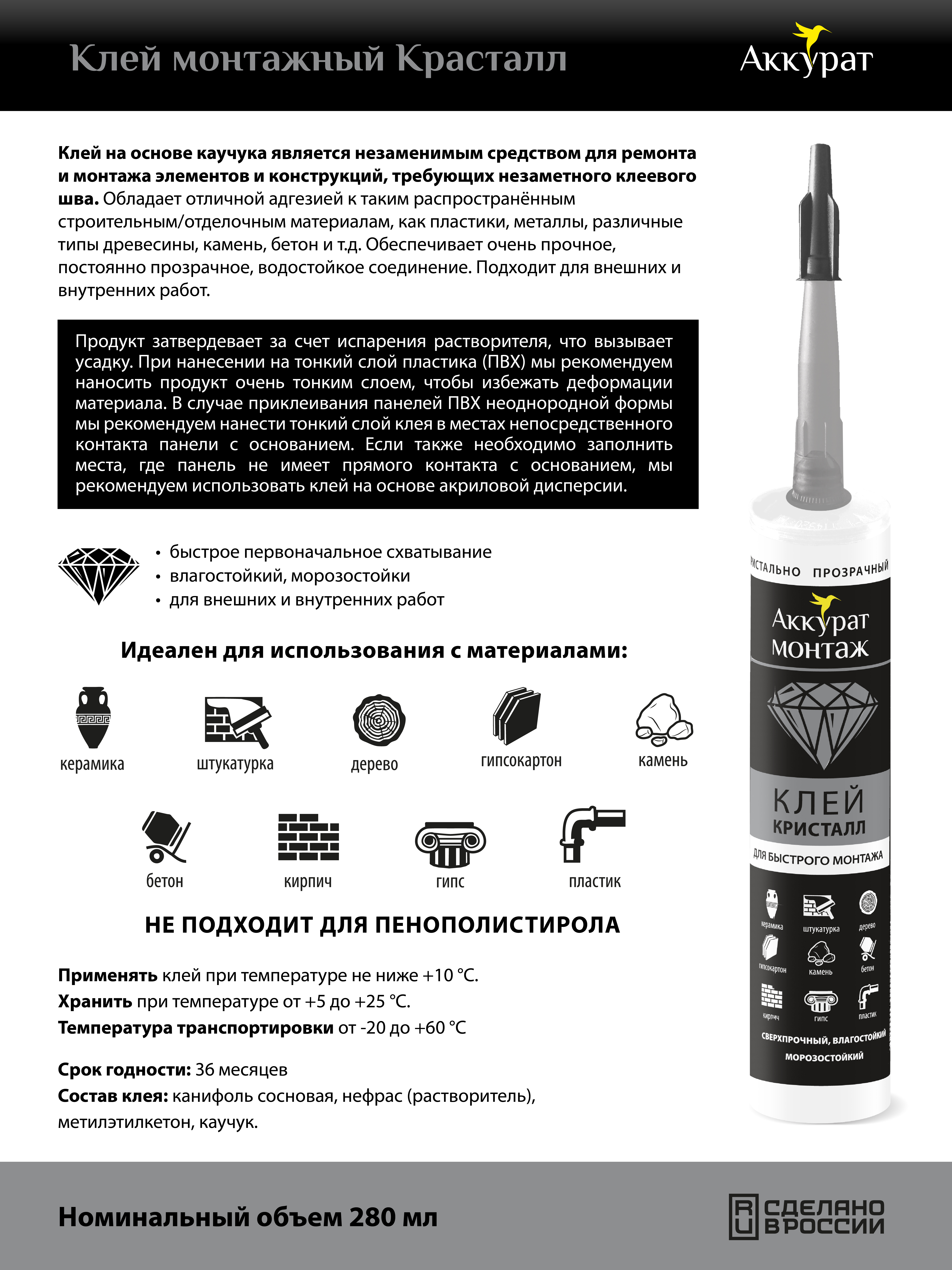 Клей монтажный Кристалл ТМ «Аккурат» на основе каучука является незаменимым средством для ремонта и монтажа элементов и конструкций, требующих незаметного клеевого шва. Обладает отличной адгезией к таким распространённым строительным/отделочным материалам, как пластики, металлы, различные типы древесины, камень, бетон и т.д. Обеспечивает очень прочное, постоянно прозрачное, водостойкое соединение. Подходит для внешних и внутренних работ.