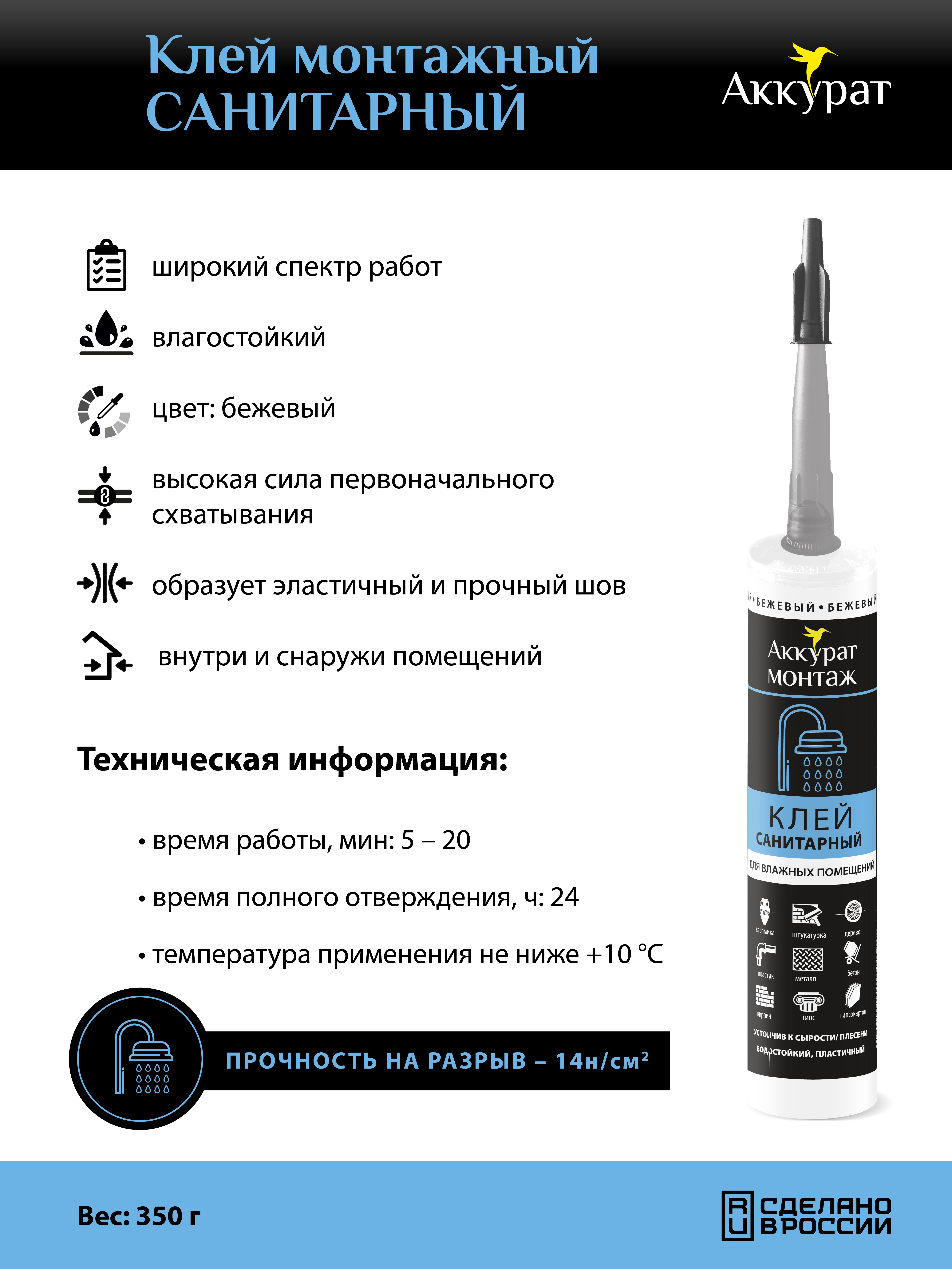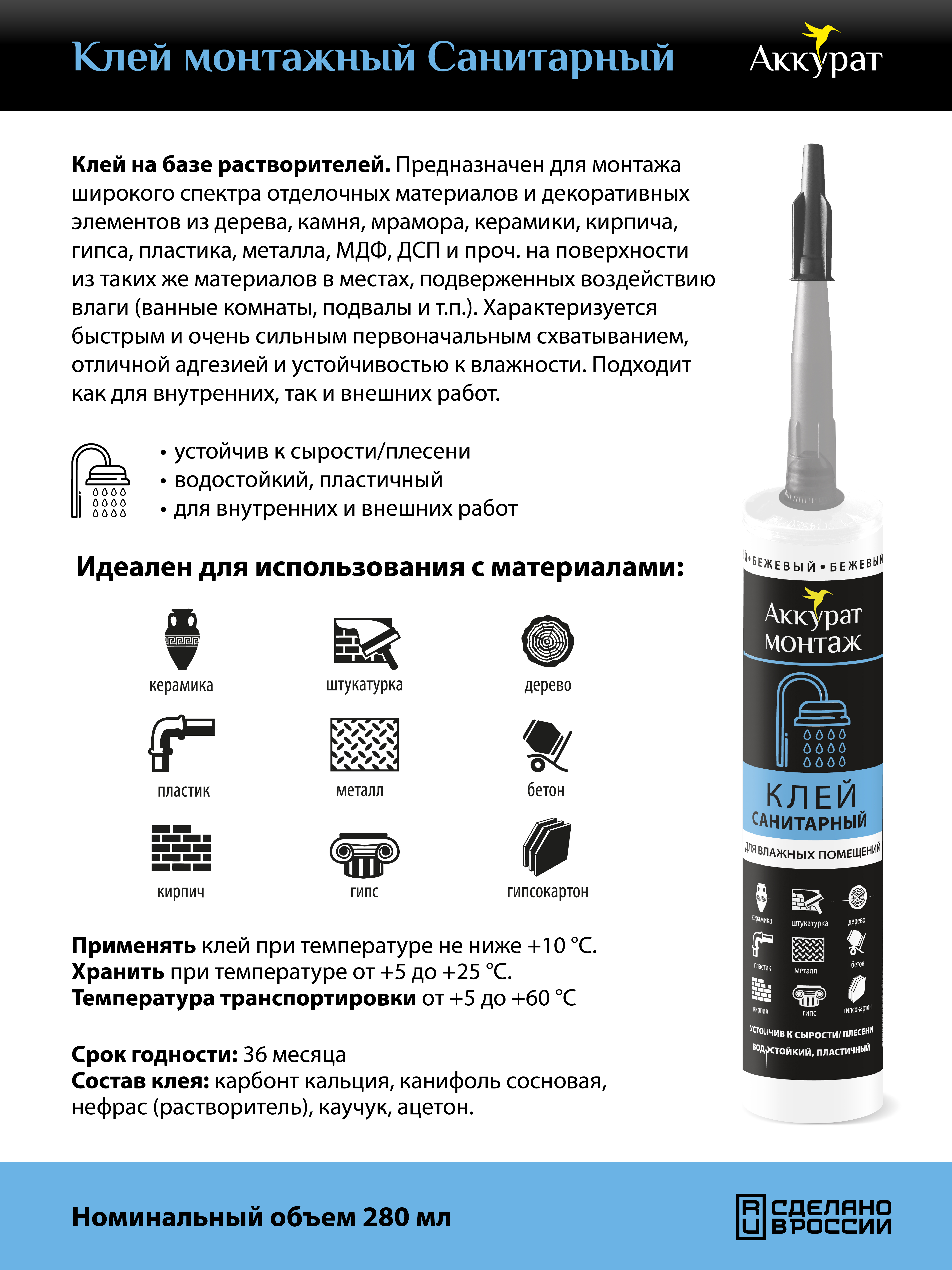 Клей монтажный Санитарный ТМ «Аккурат» - клеем на базе растворителей. Предназначен для монтажа широкого спектра отделочных материалов и декоративных элементов из дерева, камня, мрамора, керамики, кирпича, гипса, пластика, металла, МДФ, ДСП и проч. на поверхности из таких же материалов в местах, подверженных воздействию влаги (ванные комнаты, подвалы и т.п.). Характеризуется быстрым и очень сильным первоначальным схватыванием, отличной адгезией и устойчивостью к влажности. Подходит как для внутренних, так и внешних работ.