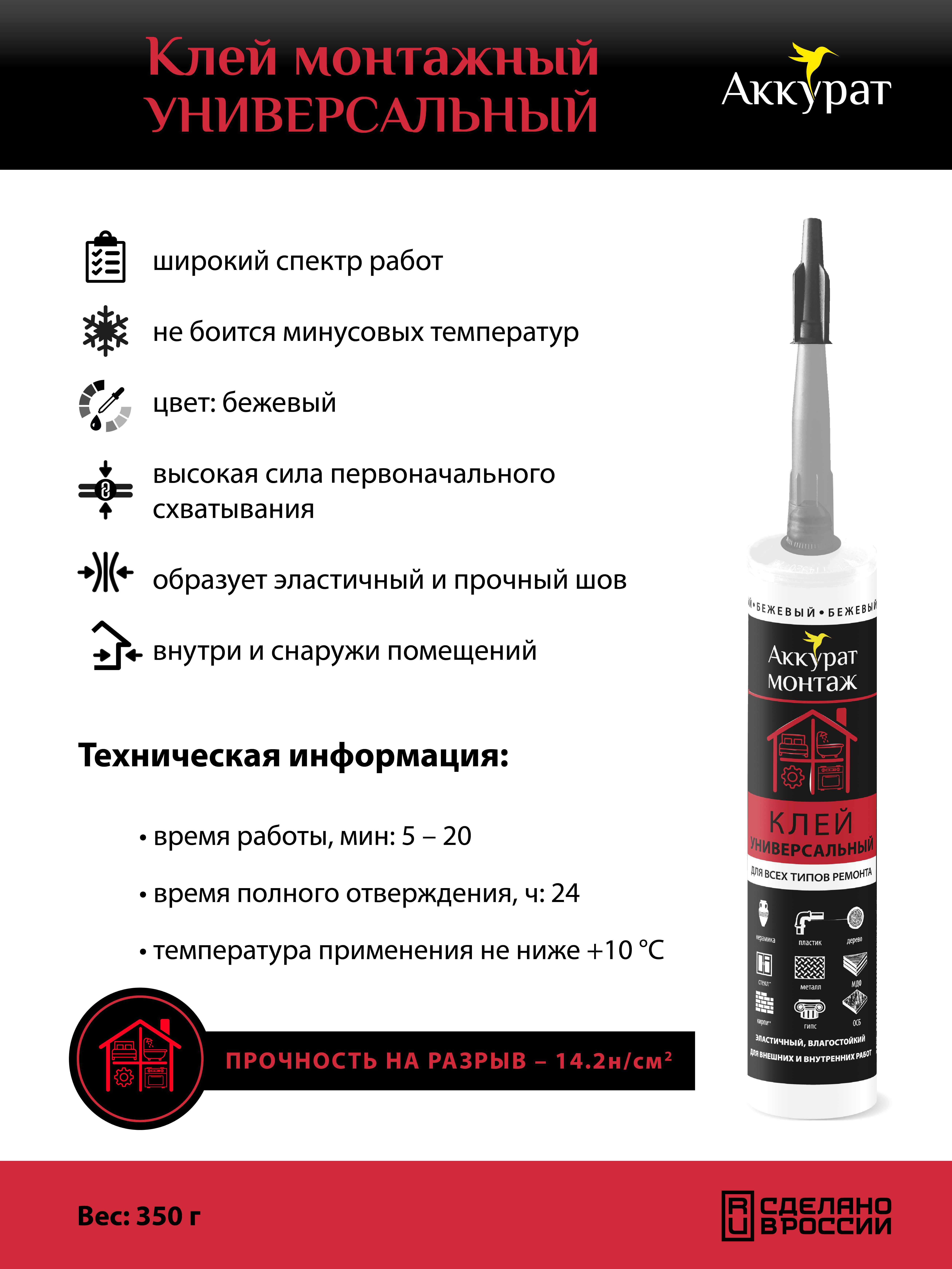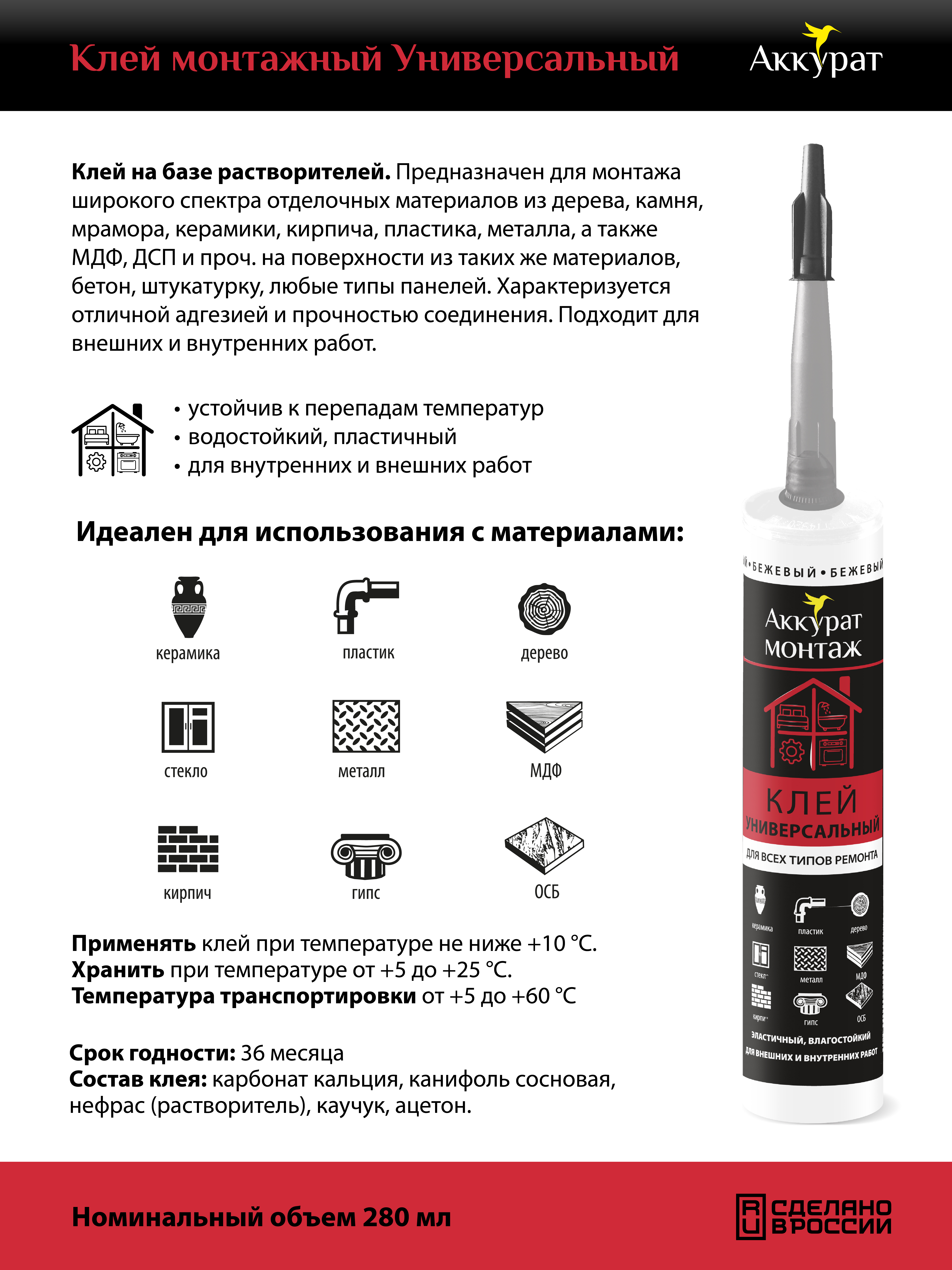 Клей монтажный Универсальный ТМ «Аккурат» - клей на базе растворителей. Предназначен для монтажа широкого спектра отделочных материалов из дерева, камня, мрамора, керамики, кирпича, пластика, металла, а также МДФ, ДСП и проч. на поверхности из таких же материалов, бетон, штукатурку, любые типы панелей. Характеризуется отличной адгезией и прочностью соединения. Подходит для внешних и внутренних работ.