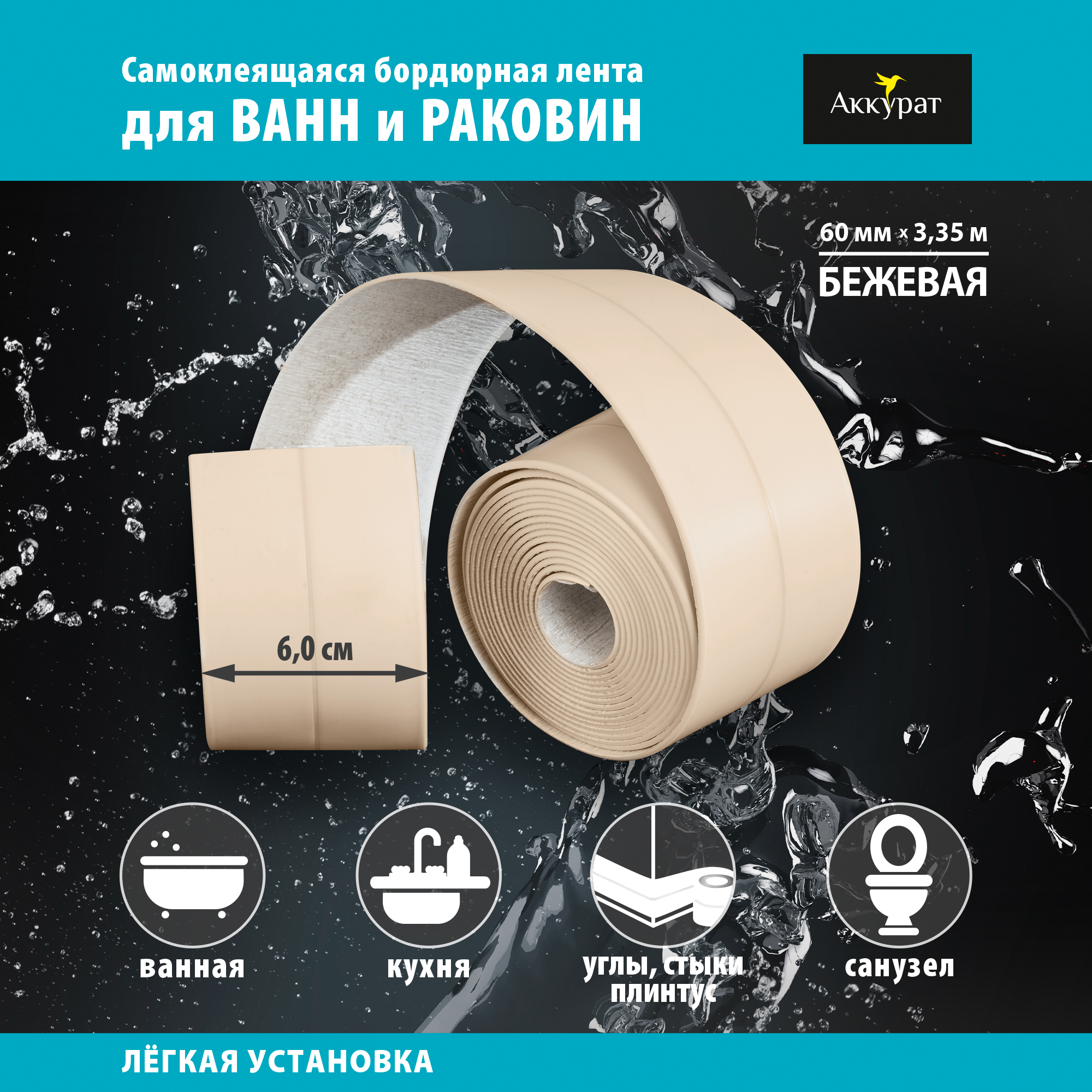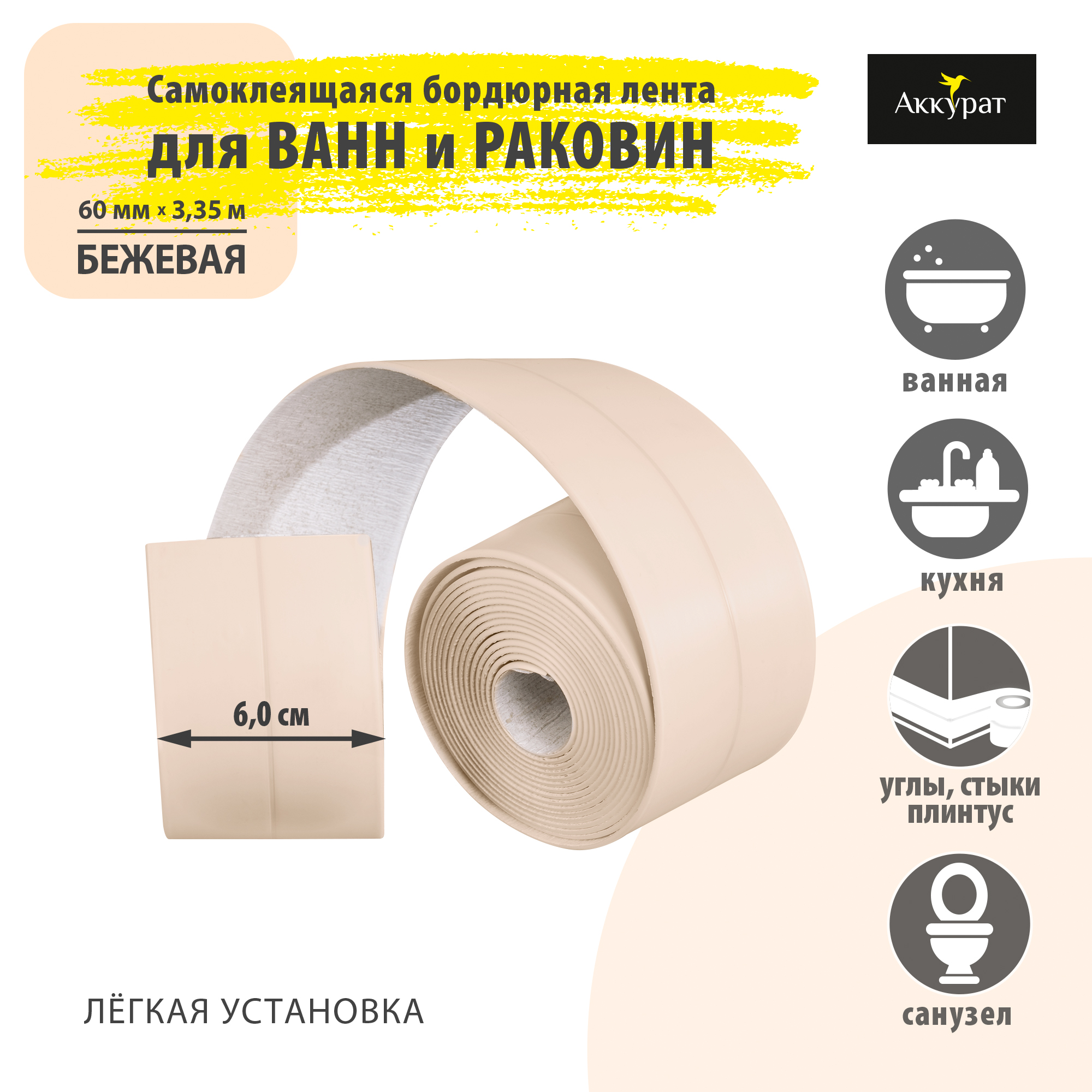 Лента бордюрная самоклеящаяся АККУРАТ 60 мм Бежевая