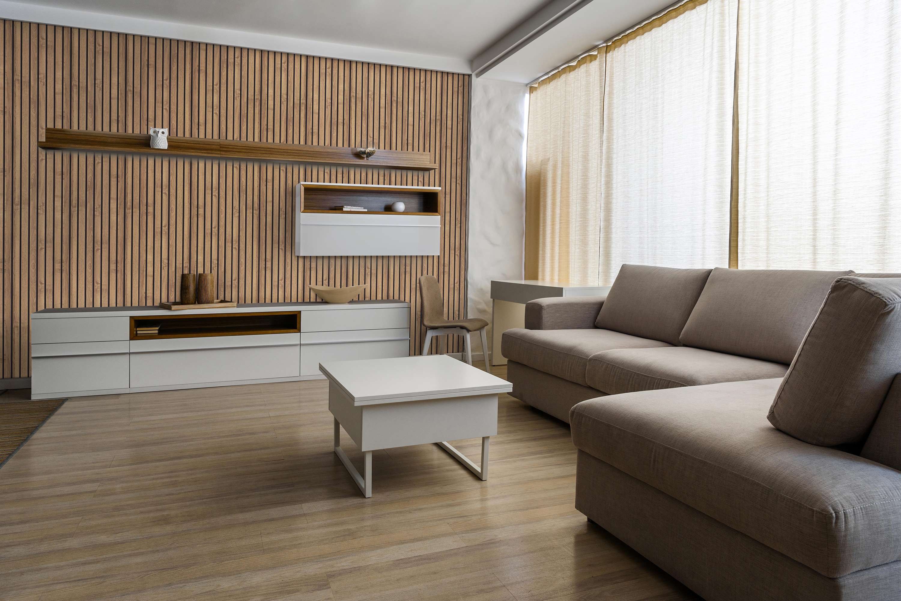 Благодаря специальной технологии стеновые панели визуально имитируют натуральную рейку, имеют так называемые русты вдоль поверхности листа.